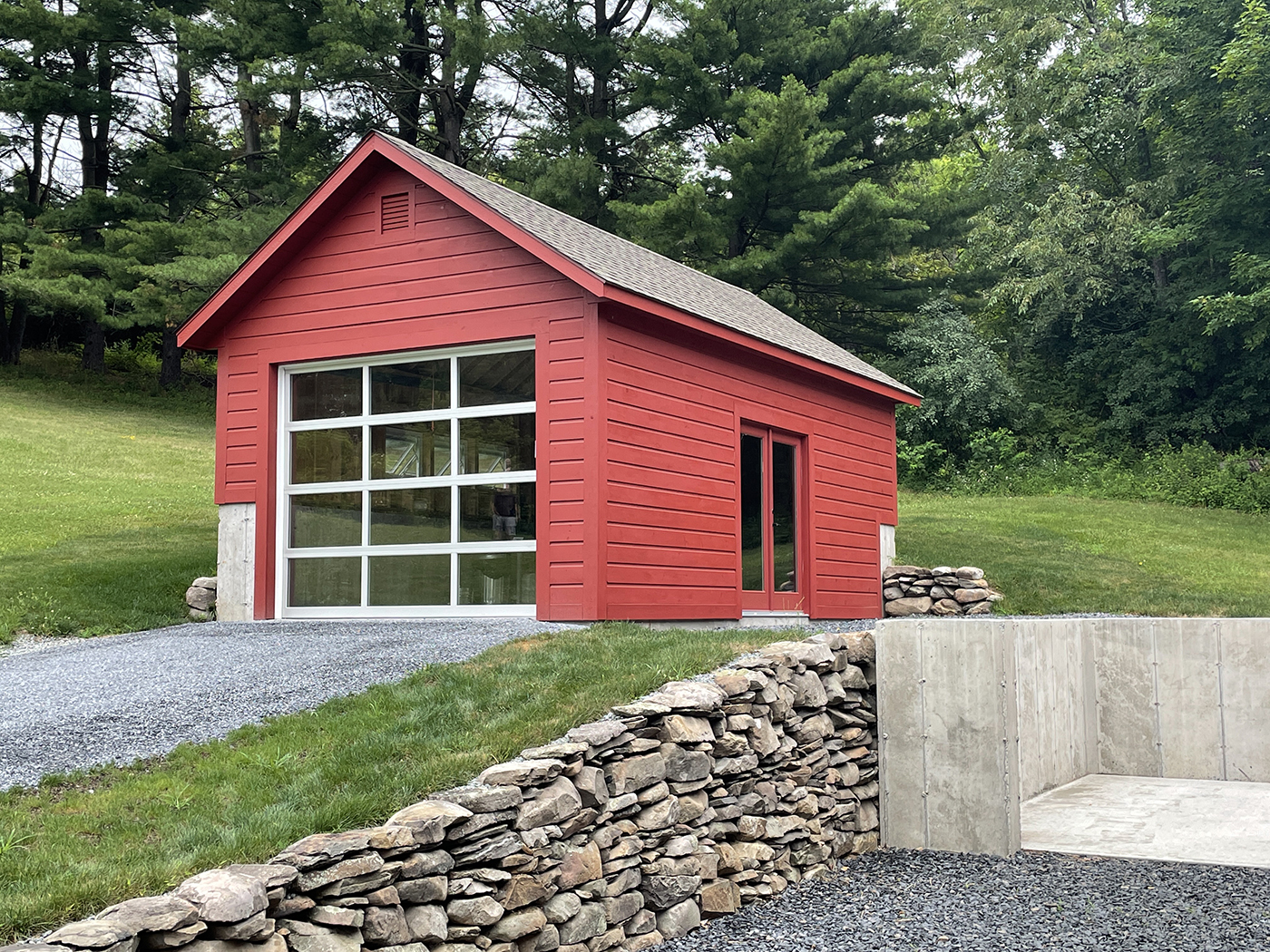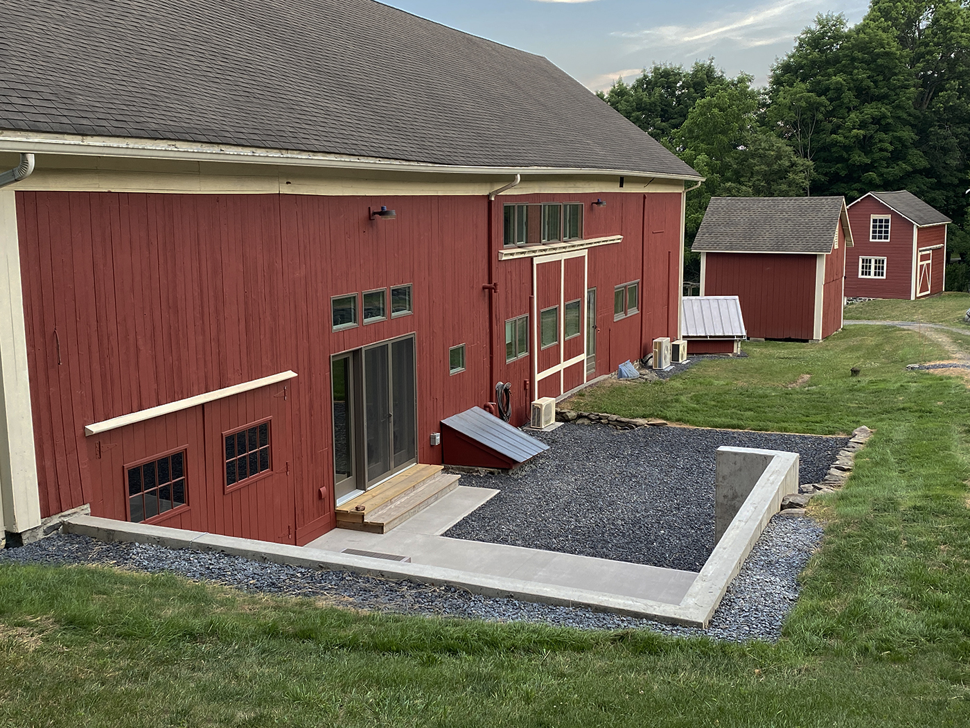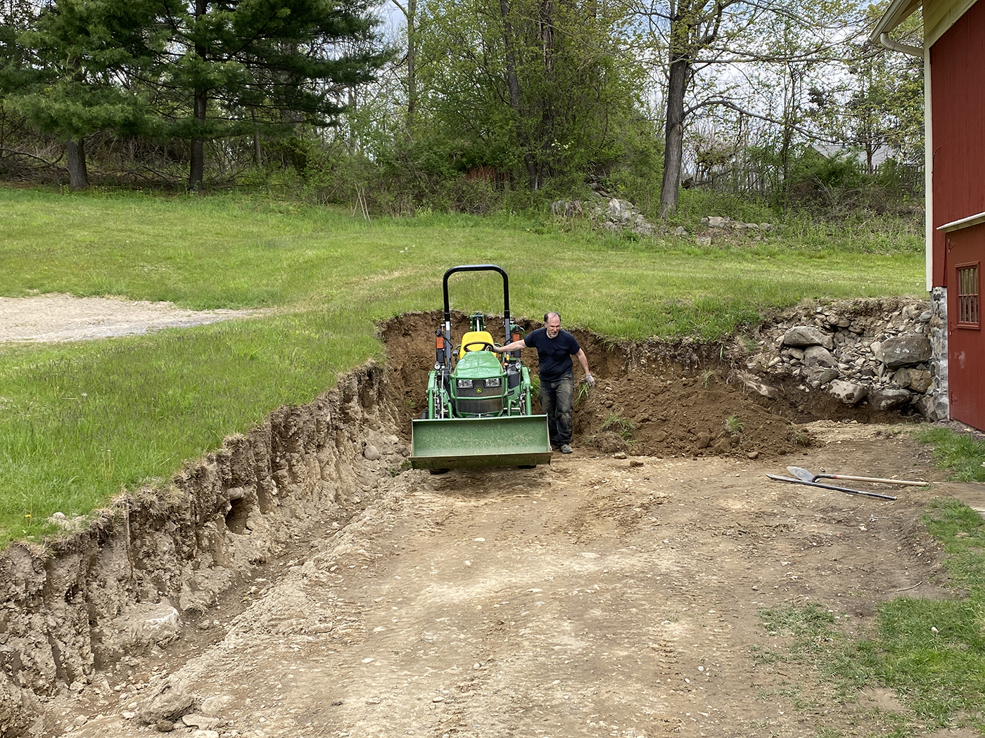 In 2015, about one third of the barn was still unfinished, allowing us (with the help of Brian's son, Tyler) to rebuild the space into a sculpture studio for Brian. A welding shed and garage would follow as well as updates to existing buildings for additional storage. We did extensive excavation and added new retaining walls to accomodate the new structures. The property is now filled with Brian's sculptures.